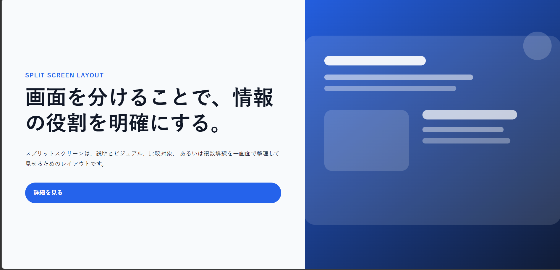 理由が明確なら、幅比率、背景色、余白、ボタン位置、モバイル時の並び順も自然に決めやすくなります。つまり、分割の理由が設計全体の軸になります。