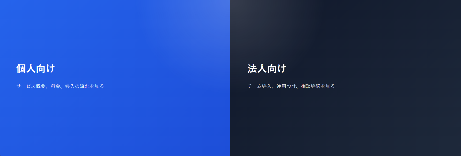 左右それぞれを別導線として使う型です。個人向けと法人向けのように、ユーザー入口を明確に分けたい場合に向いています。つまり、これは 選択構造をそのままレイアウトにした型 です。